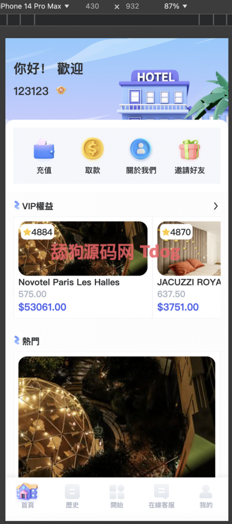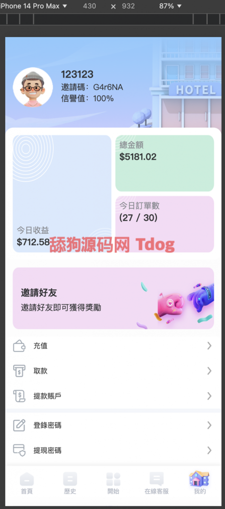 UI非常精美的一套海外酒店刷单抢单源码,功能也非常简单,就是刷单理财,没有多余的功能,充提默认用的是银行卡,可以二开加TRC20、BTC、第三方在线支付等方式